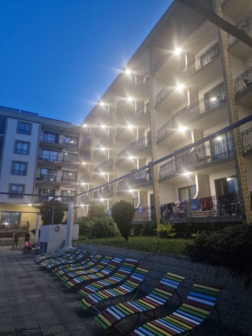 На території є пляж, спортивні майданчики та сцена для вечірніх заходів.